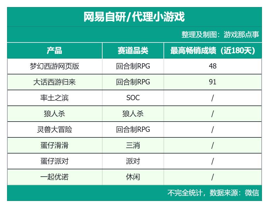 截至目前,在2025中国小游戏百强企业榜中排名28的网易,推出了《梦幻西游网页版》《大话西游归来》《率土之滨》《狼人杀》《灵兽大冒险》《蛋仔滑滑》《蛋仔派对》(抖音端)《一起优诺》等多款小游戏(不完全统计)。并且与腾讯的情况类似,这些产品大多是基于APP移植过来的小游戏版本。
