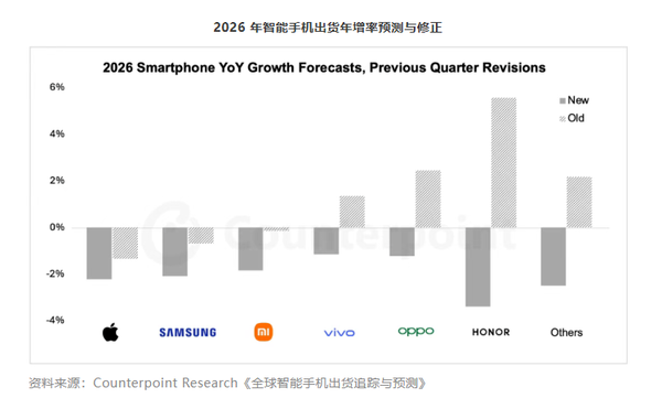 2026年,对厂商和消费者而言,都注定是充满挑战的一年,难言友好。机构Counterpoint Research的最新预测显示,在人工智能硬件需求激增、推高芯片与存储器成本的大背景下,全球智能手机市场将在2026年面临收缩,行业整体呈现出“量减价升”的严峻态势。其最新报告将2026年全球智能手机出货量预测大幅下调约2.6%,预计出货量同比下降约2.1%,并且不再局限于少数品牌下滑,而是“几乎所有主要厂商”都将遭遇年度出货量的下跌。