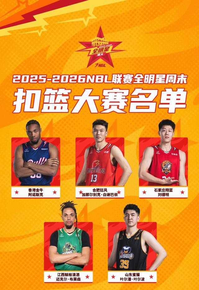 扣篮大赛名单:阿诺斯克(香港金牛)、加那尔别克-白谢巴依(合肥狂风)、刘德明(石家庄翔蓝)、迈克尔-布莱森(江西鲸裕清酒)、叶尔潘-叶尔波(山东蜜獾)。