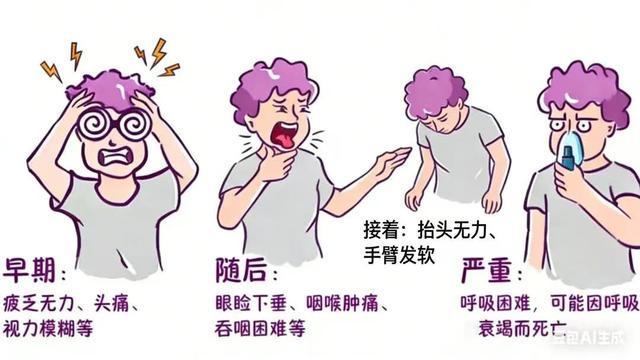 第一阶段:看东西模糊、重影、眼皮下垂、口干舌燥。