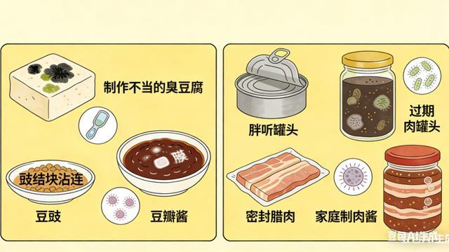 自制发酵食品:自制发酵和腌制食品往往是引起肉毒中毒的“元凶”,例如腌肉、豆豉、腐乳、臭豆腐、罐头等。