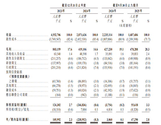 值得注意的是,该公司财务数据显示:公司营业收入从2023年的45.53亿元下滑至2024年的28.72亿元,2025年前三季度为16.88亿元。