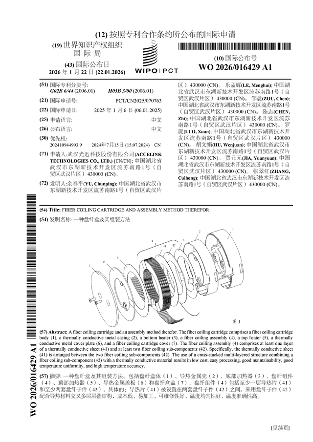 证券之星消息,根据企查查数据显示光迅科技(002281)公布了一项国际专利申请,专利名为“一种盘纤盒及其组装方法”,专利申请号为PCT/CN2025/070763,国际公布日为2026年1月22日。