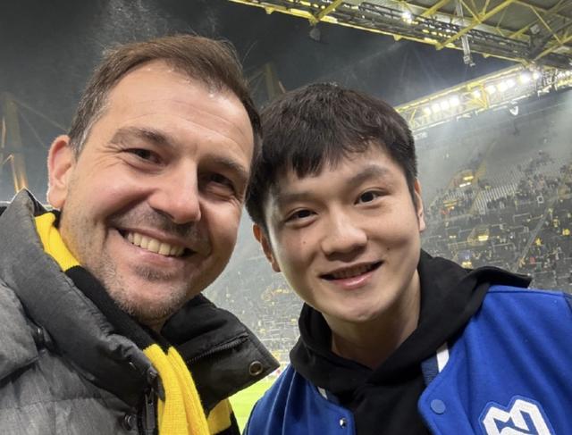 樊振东目前效力于乒乓球德甲俱乐部萨尔布吕肯,此番他依然是与好友波尔一同出现在多特主场,观看比赛。