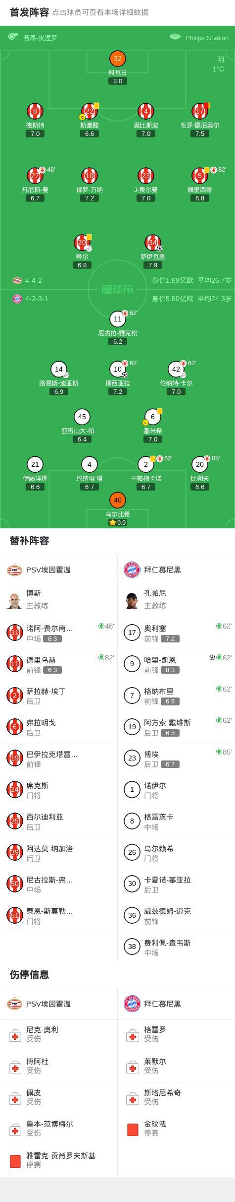 北京时间1月29日欧洲冠军联赛 联赛阶段 第8轮,PSV埃因霍温对阵拜仁慕尼黑。PSV埃因霍温萨伊瓦里破门。拜仁慕尼黑穆西亚拉破门,哈里-凯恩破门。最终比分PSV埃因霍温 1-2 拜仁。