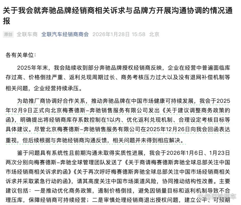 日前,全国工商联汽车经销商商会(简称“全联车商”)发布《关于我会就奔驰品牌经销商相关诉求与品牌方开展沟通协调的情况通报》,披露了2025年底以来围绕梅赛德斯-奔驰中国经销商经营困难所进行的多轮交涉情况。
