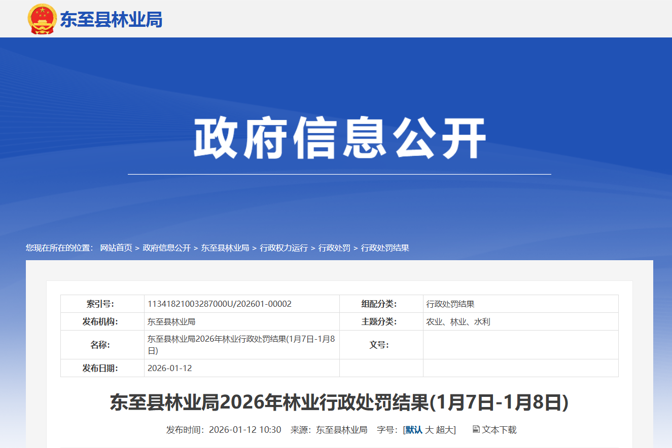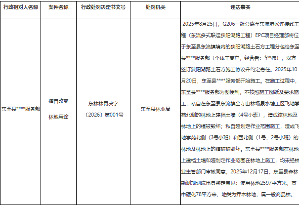 近日,东至县林业局公开披露行政处罚信息,因擅自改变林地用途,安徽两家企业被罚。行政处罚决定书文号分别是东林林罚决字〔2026〕第001号和东林林罚决字〔2026〕第002号。