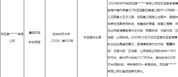 公开处罚信息显示,2025年8月开始凤阳县******有限公司在东至县官港镇官港村境内承建S27东至至鄱阳高速公路DP-02标段一工区路基土石方工程,在路基工程施工过程中,超越林地审批范围使用林地,修建临时便道、搭建工棚等,非法占用官港镇官港村王村组“板栗树坞”与官村组“正坞里”山场林地。2025年12月30日东至县东至官港镇林业站出具鉴定意见:官港镇官港村王村组“板栗树坞”与官村组“正坞里”山场违规占用林地共计1841平方米,其中乔木林地1317平方米,其他林地524平方米(疏林地),森林类别为一般商品林。凤阳县******有限公司对鉴定结果无异议。
