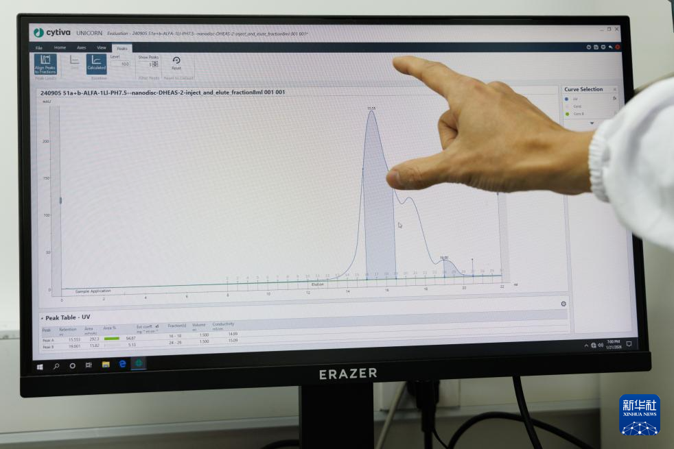 1月21日,在中国科学院物理研究所软物质实验室,姜道华研究员在分析蛋白质的纯化结果。