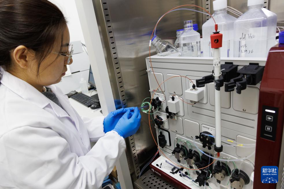 1月21日,在中国科学院物理研究所软物质实验室,第一作者王柯博士在将蛋白质样品注入AKTA蛋白纯化仪。