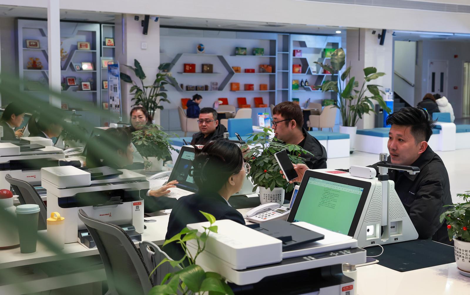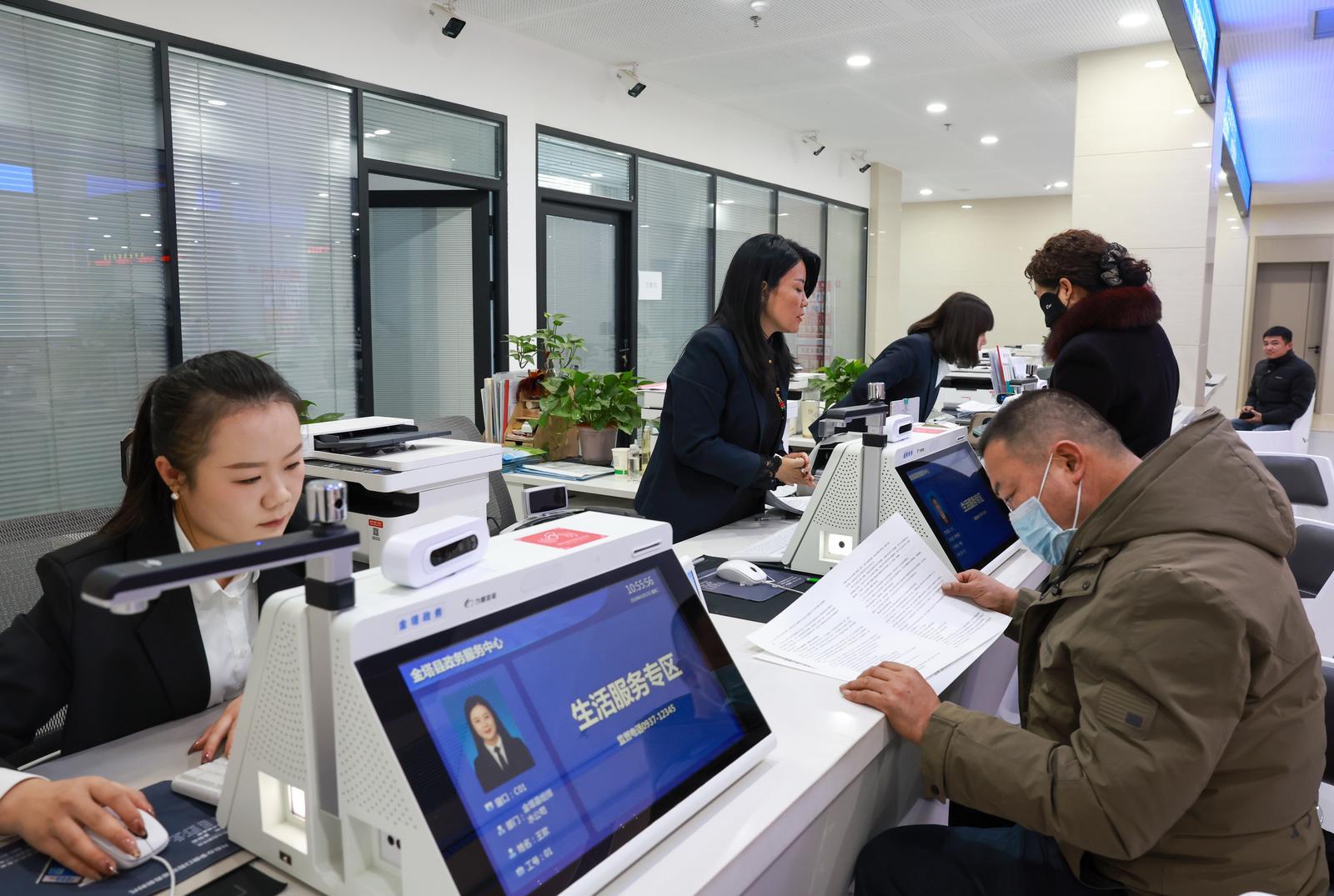 近日,金塔县政务服务中心大厅内,各服务窗口有序接待办事群众,为群众办理业务。