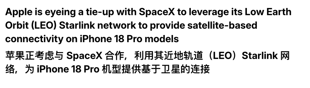 据外媒报道,苹果与SpaceX正秘密推进一项颠覆性合作,即将于今年秋季发布的 iPhone 18 Pro 有望成为首款 直接接入SpaceX星链卫星网络 的智能手机。