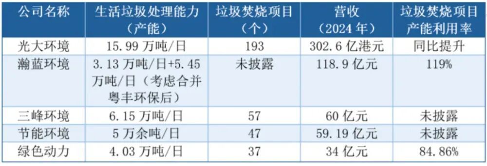 部分垃圾焚烧类上市企业的业务数据 图源:每日经济新闻