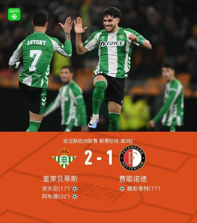 北京时间1月30日欧足联欧洲联赛 联赛阶段 第8轮,皇家贝蒂斯对阵费耶诺德。皇家贝蒂斯安东尼破门,阿布德破门。费耶诺德滕斯泰特破门。最终比分皇家贝蒂斯 2-1 费耶诺德。