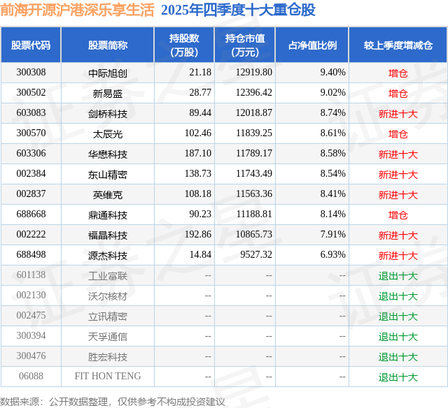 前海开源沪港深乐享生活的前十大重仓股如下: