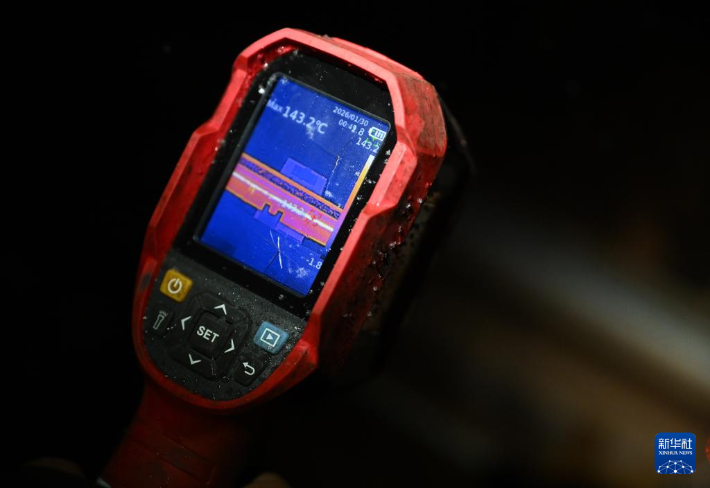 1月30日,国铁集团郑州局郑州高铁基础设施段职工使用红外测温枪检查道岔融雪系统实时温度。