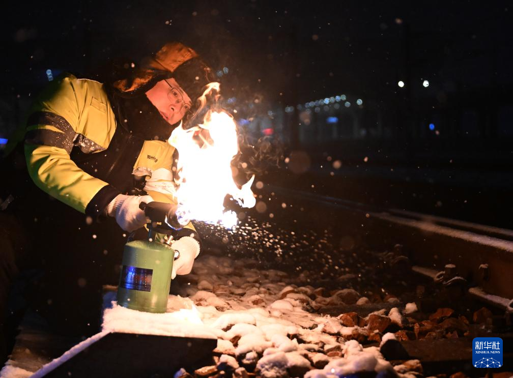 1月30日,国铁集团郑州局郑州高铁基础设施段职工使用汽油喷枪对道岔设备进行除雪融冰作业。
