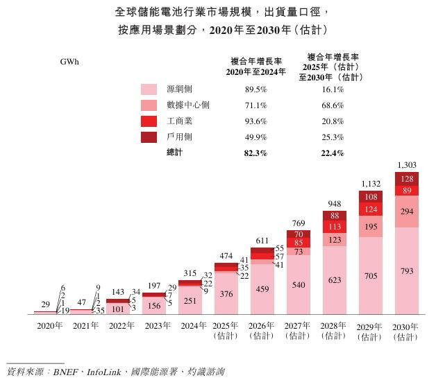 值得注意的是,AI和云计算的新起浪潮正在带动全球数据中心能源需求以及对储能系统作为备用电源的需求快速上升,数据中心侧储能成为增速最快的细分领域。数据中心侧储能电池出货量从2020年的1 GWh增长至2024年的9 GWh,复合年增长率为71.1%,并预计于2030年提升至294 GWh,2025年至2030年的复合年增长率为68.6%。
