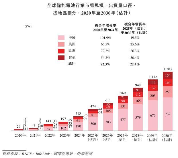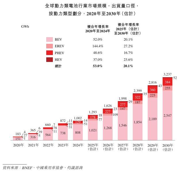 全球动力类电池出货量从2020年的183 GWh增长至2024年的1,002 GWh,复合年增长率为53.0%,并预计从2025年的1,293 GWh进一步提升至2030年的3,237 GWh,复合年增长率为20.1%。