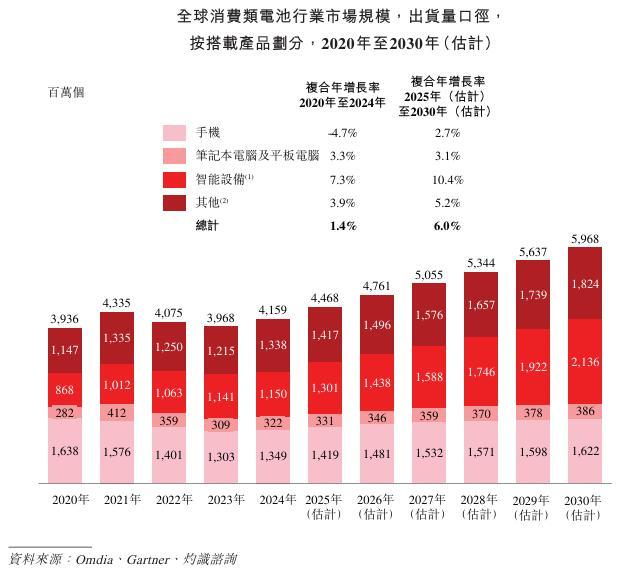 根据灼识咨询的资料,全球消费类电池出货量由2020年的3,936百万个增长至2024年的4,159百万个,复合年增长率为1.4%。于2022年及2023年,市场经历了短暂萎缩,主要原因是手机需求下降,但2024年呈现强劲复苏,并预计由2025年的4,468百万个提升至2030年的5,968百万个,复合年增长率为6.0%。手机、笔记本计算机及平板计算机广泛融入日常生活中,是最常用的消费电子产品,在现代数字化生活方式中发挥核心作用。其中,作为全球出货量最大的消费电子品类,2024年手机电池的出货量达到1,349百万个,占整体消费类电池出货量的32.4%。