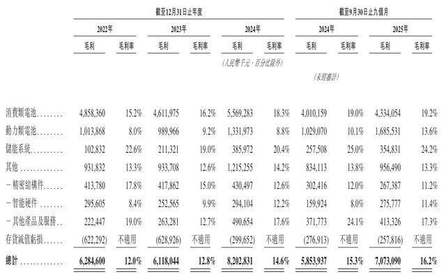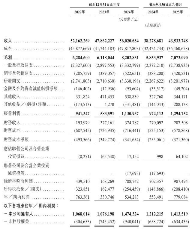 于2022年度、2023年度、2024年度、2025年截至9月30日止九个月,公司录得毛利分别约62.85亿元、61.18亿元、82.03亿元、70.73亿元,对应毛利率分别为12.0%、12.8%、14.6%、16.2%。