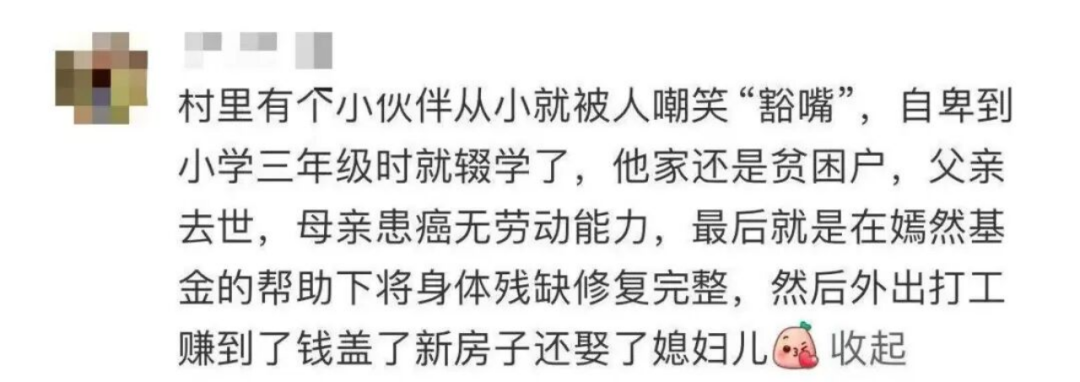 其中有一个男孩儿,曾因先天性唇腭裂的男孩儿被嘲笑“豁嘴”,三年级的时候,这个孩子在一片嘲笑声里中断了学业。