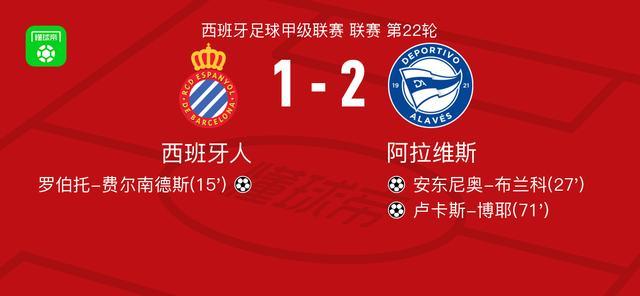 北京时间1月31日西班牙足球甲级联赛 联赛 第22轮,西班牙人主场对阵阿拉维斯。西班牙人罗伯托-费尔南德斯破门。阿拉维斯安东尼奥-布兰科破门,卢卡斯-博耶破门。最终比分西班牙人 1-2 阿拉维斯。