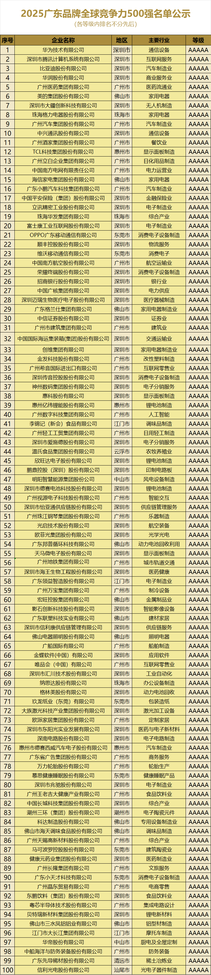 经过企业自主申报、大数据分析、实地调研和专家评审等多环节严格评定,华为、腾讯、比亚迪、美的、格力、广药、王老吉、华润、大疆、广汽、中兴、广州酒家、TCL、立白、海信、小鹏、立讯精密、OPPO、vivo、李锦记、欣旺达、德赛电池、薇美姿、昊志、长园科技、索达、科翔、双喜等500家获评AAA及以上等级的申报企业最终入选“2025广东品牌全球竞争力500强”,涵盖制造、科技、消费、金融等多个核心领域,集中展现了广东“制造业当家”的硬核实力与品牌全球化潜力。