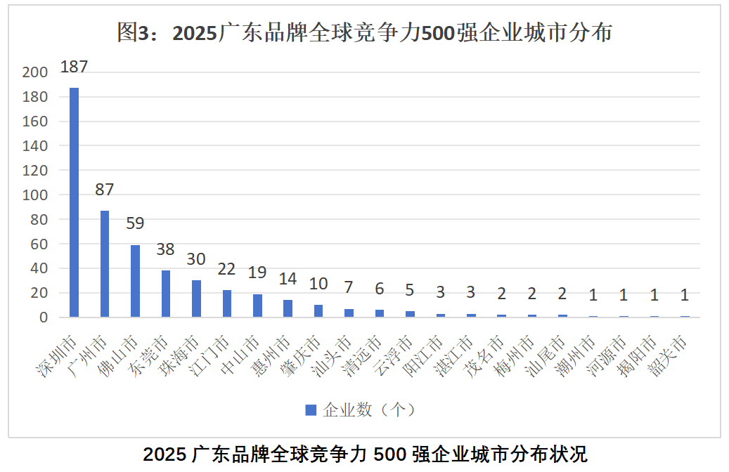 区域分布上,深广佛三城上榜企业占全省总数的66.7%,其中深圳市以187家上榜企业居首,诞生了华为、腾讯、比亚迪等一批世界级头部企业,为全球创新资源的重要集聚地;广州市87家企业上榜,SHEIN以90%的海外占比和3000亿级营收,成为广州跨境电商的全球名片;佛山市59家企业入选,美的、格兰仕等筑牢制造业根基。东莞(38家)、珠海(30家)、中山(19家)、江门(22家)等珠三角城市均有超10家企业上榜,粤东西北地区汕头(7家)、云浮(5家)、湛江(3家)、阳江(3家)、汕尾(2家)、茂名(2家)、梅州(2家)和潮州、揭阳、河源、韶关也各有1家入选,形成全域协同发展格局。