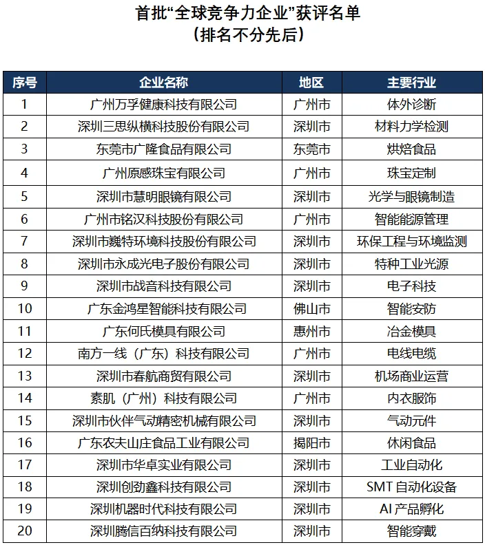 凭借在细分赛道的创新突破与全球化实践,共有万孚健康、三思纵横、广隆蛋挞王、原感珠宝、慧明眼镜、铭汉、巍特环境、永成光电子、战音、金鸿星、何氏模具、南方一线、春航商贸、素肌、伙伴气动、农夫山庄、华卓实业、创劲鑫、机器时代、腾信百纳等20家申报企业获评“全球竞争力企业”。这些企业在技术研发、海外渠道拓展或本土化运营方面形成独特优势,为中小企业出海提供了可借鉴的实践样本。