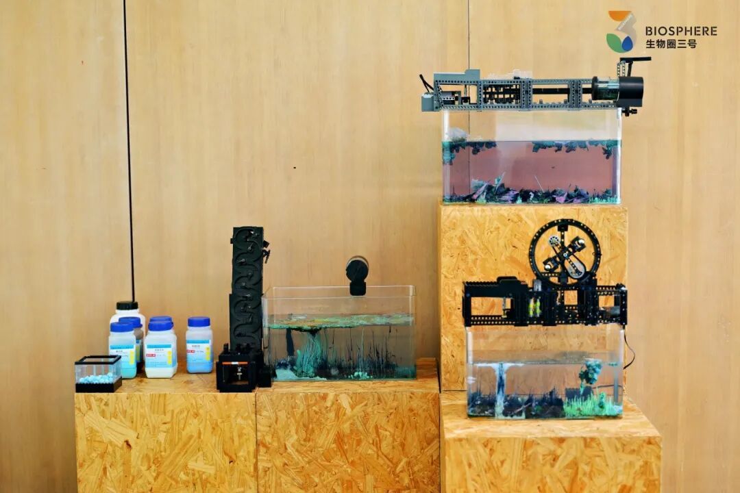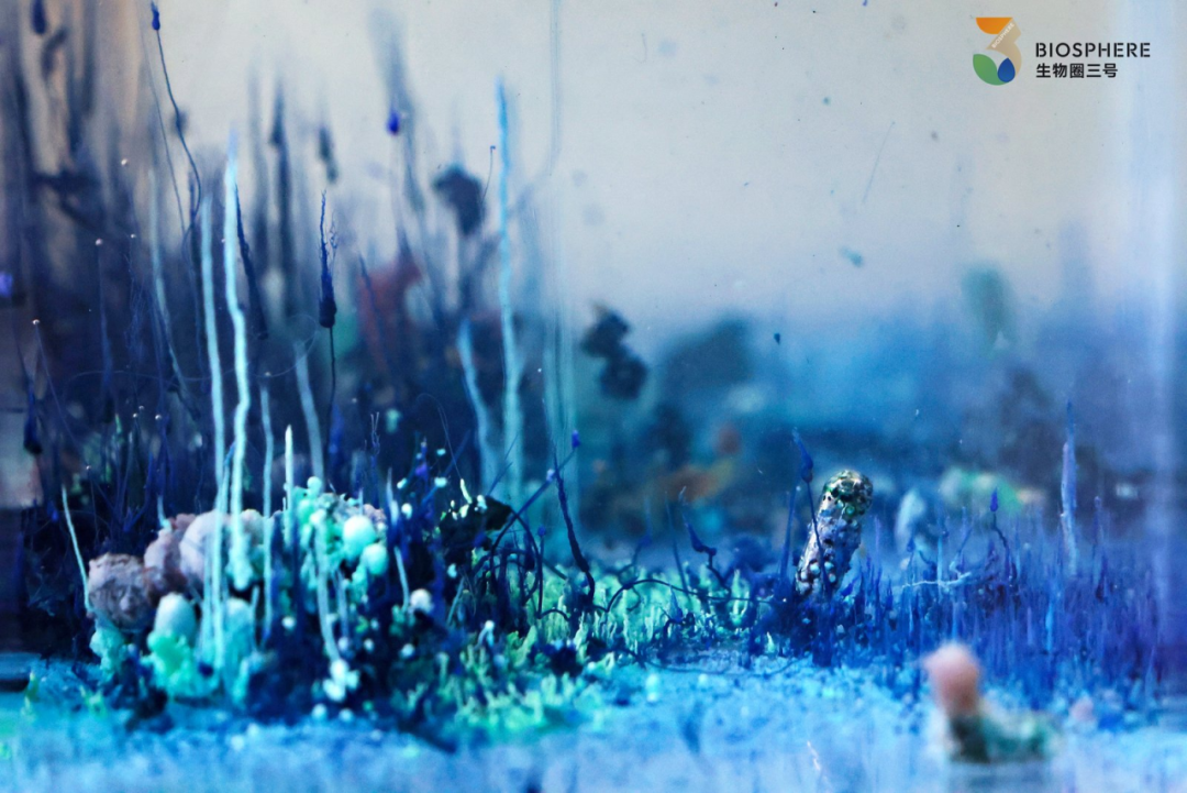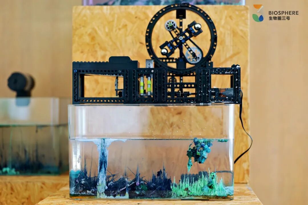 使用流水线自动装置,将金属盐自动投放到硅酸钠中,以化学反应模拟海洋潮汐景象,展现海洋生态的持续生成过程。装置开放公众干预通道,居民可通过记录的潮汐观察日记,调整金属盐投放频率。