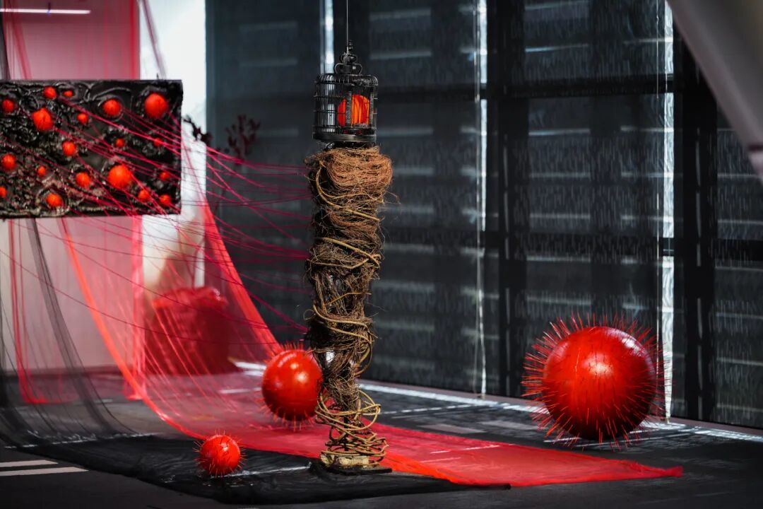 用塑料瓶盖、奶茶袋等日常废料,编织“鱼笼”,发出一个本质的疑惑——当我们在收获与获得中不断付出代价时,是否仍能找到一份安宁。