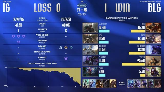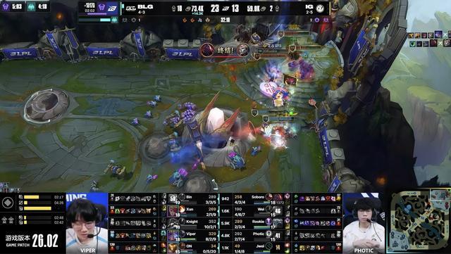 第26分钟,BLG组织推进,iG无力抵挡,第一局游戏结束。