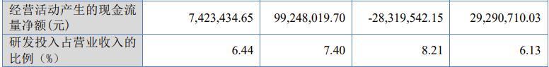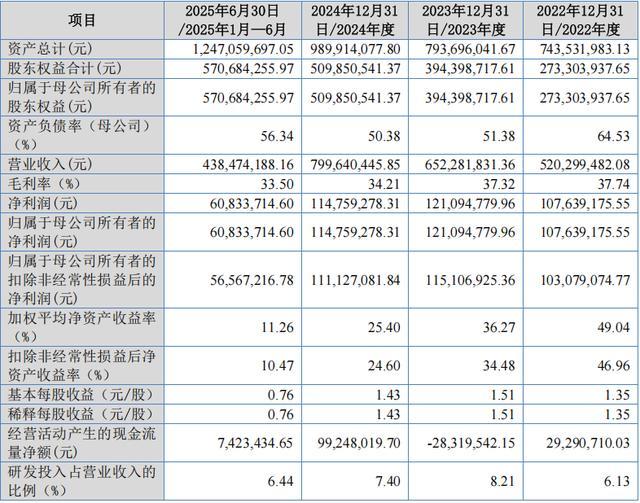 2022年、2023年、2024年,公司实现营业收入分别为5.2030亿元、6.5228亿元、7.9964亿元,扣非归母净利润分别为1.0308亿元、1.1511亿元、1.1113亿元。 2024年营收同比增长22.59%、扣非归母净利润同比却下降3.46%。2022年经营活动产生的现金流量净额为2929万元,2023年却为-2832万元,2024年又暴增至9925万元,波动幅度大。