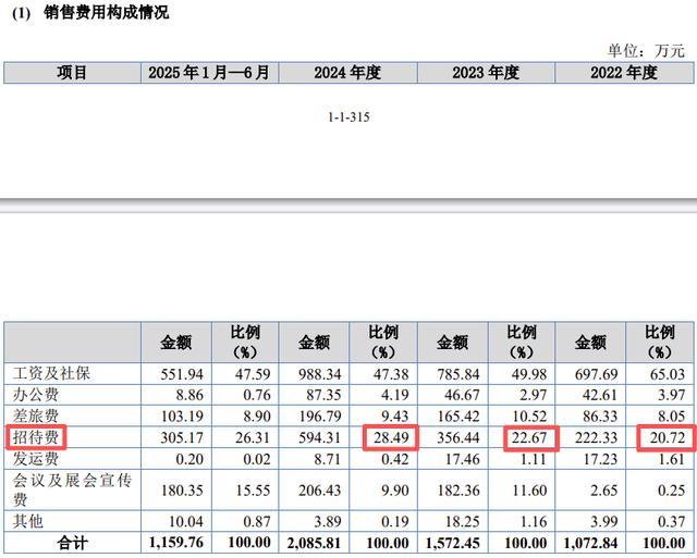 2023年、2024年,销售费用中招待费金额持续增长且招待费占销售费用的比例也持续上升。2022年,销售费用中招待费222.33万元,占销售费用的比例为20.72%,2023年招待费占销售费用的22.67%,2024年招待费占销售费用的比例进一步上升到28.49%。