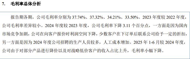 2022年、2023年、2024年及2025年上半年,发行人的毛利率分别为 37.74%、37.32%、34.21%、33.50%,呈现持续下降的趋势。 2023 年度较 2022 年度,公司毛利率差异较小。2024 年度较 2023 年度,公司毛利率下降 3.11 个百分点,一方面是因为国内市场竞争加剧,公司在向客户报价时利润空间下降,少数客户在下订单后联系公司给予一定的折扣,另一方面是因为 2024 年度公司招聘的生产人员较多,人工成本增加。2025 年 1-6 月较 2024 年度,公司由于对部分产品进行降价以及对战略低价客户的收入占比上升,毛利率小幅下降。