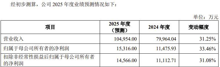 公司 2025 年度预计实现营业收入 10.4954亿元,较 2024 年度预计增长幅度为 31.25%;预计实现扣非归母净利润为 1.4566亿元,较 2024 年度预计增长幅度为 31.08%。