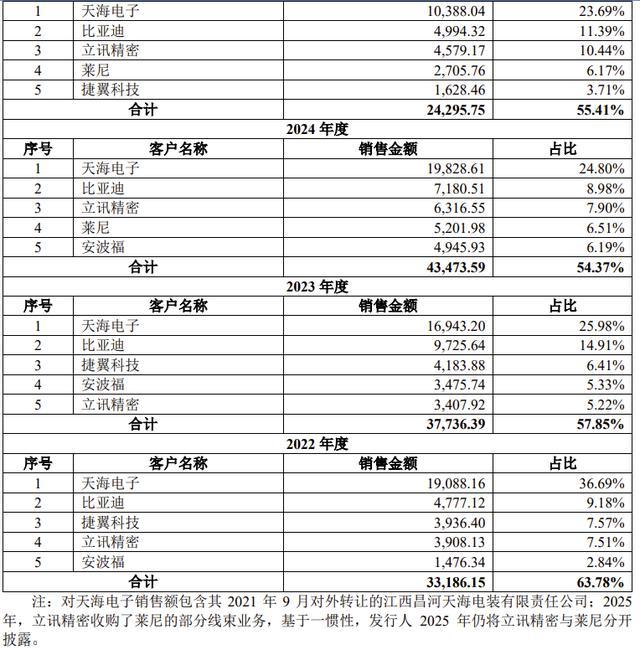 2022年、2023年、2024年及2025年1-6月,公司对前五大客户销售收入分别为 33,186.15 万元、37,736.39 万元、43,473.59 万元、24,295.75 万元,占比分别为 63.78%、57.85%、54.37%、55.41%。公司前五大客户均是汽车或汽车线束领域的知名企业。