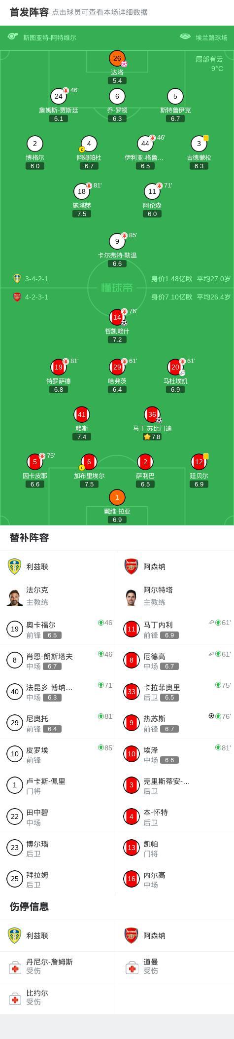 第69分钟,马丁内利替补送出传中,哲凯赖什撞射破门,阿森纳3-0领先