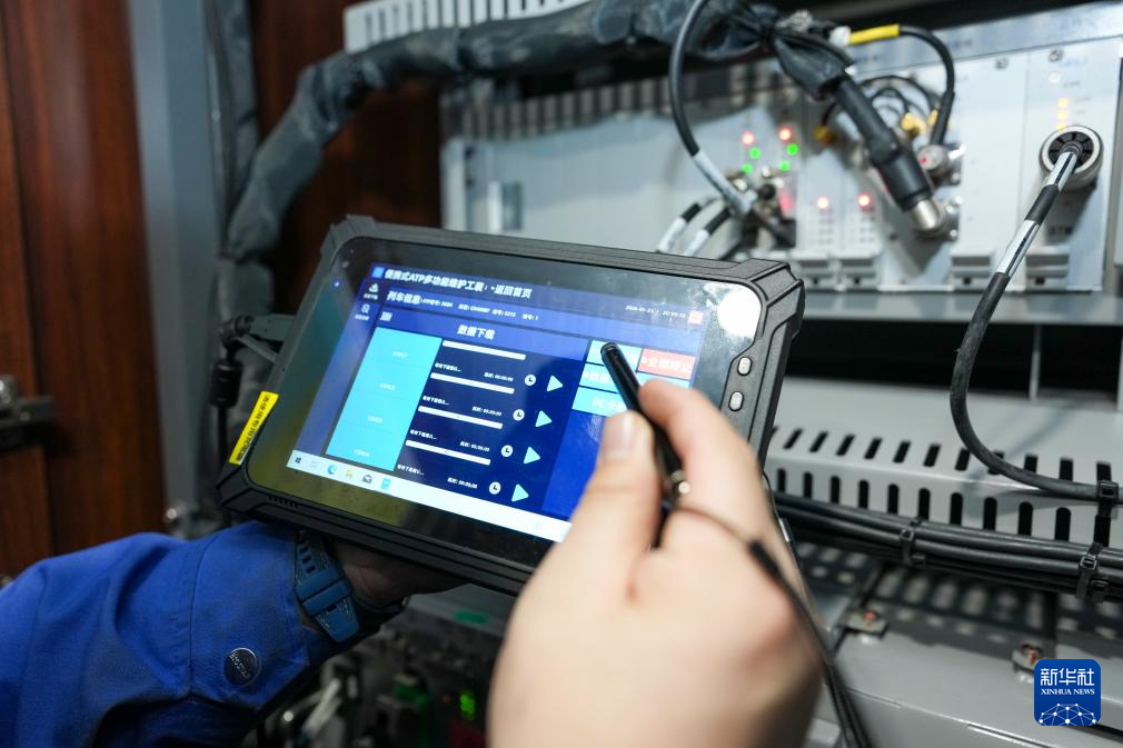 在中国铁路哈尔滨局集团有限公司哈尔滨动车段检修库,电务段信号工人对动车组ATP列车超速自动防护系统进行检测作业(1月31日摄)。