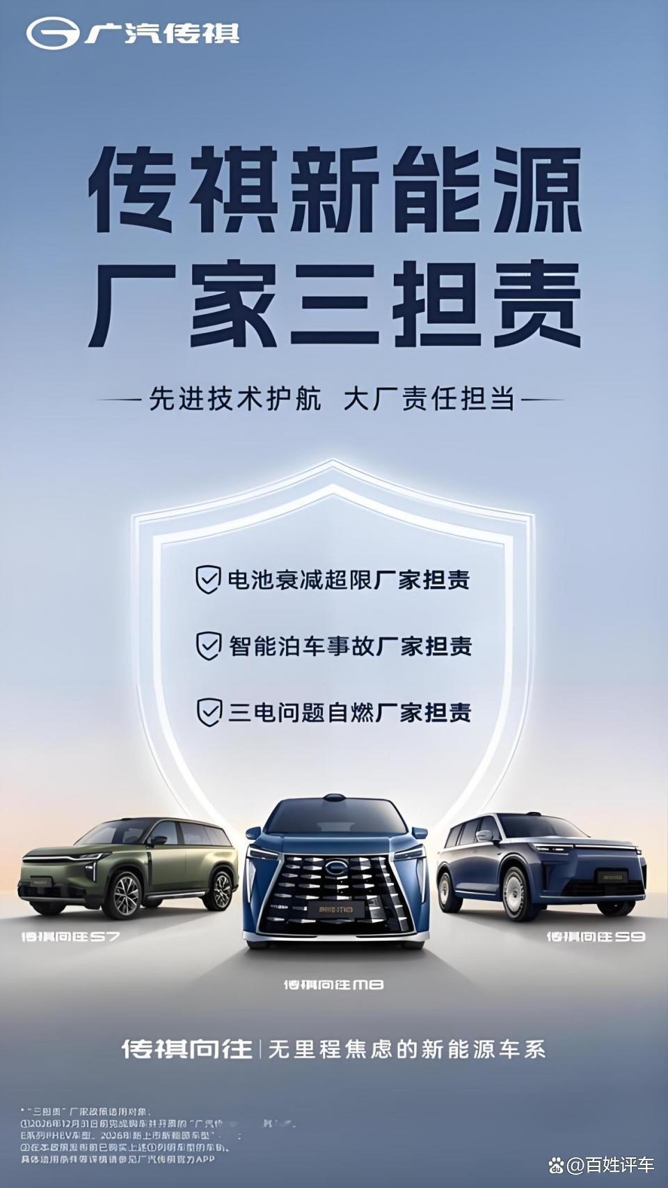 广汽传祺最近还推出了“三担责”政策,即电池衰减超限、智能泊车出事故、三电系统自燃,这三种情况他们主动兜底。现在,新能源车用户早就不只关心产品参数,比如续航里程长短,更在意有问题谁负责。很多品牌对智驾事故直接免责,电池质保也只管年限。传祺反其道而行,把责任边界往前推了一步。尤其是M8、GS8、E8这类主打家庭和商务的车型,用户对安全和售后极其敏感,这种承诺比广告词管用得多。