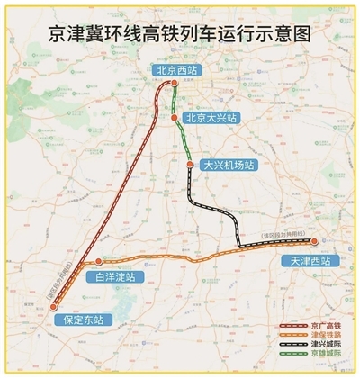 “京津冀环线高铁”的开通属于铁路部门实行新的列车运行图的其中一环。据介绍,此次调图后北京西站共安排旅客列车193对,其中动车组列车131对。