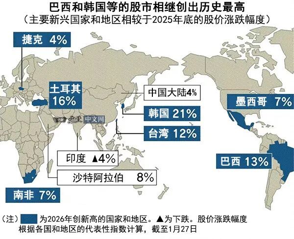 比如巴西股市。综合交易所B3的数据显示,2026年初至1月23日外国投资者的净买入额为177亿雷亚尔(约合人民币237亿),已是2025年全年的一半以上。有预期认为,巴西央行将因通胀趋于稳定而转向降息,正在吸引海外资金。