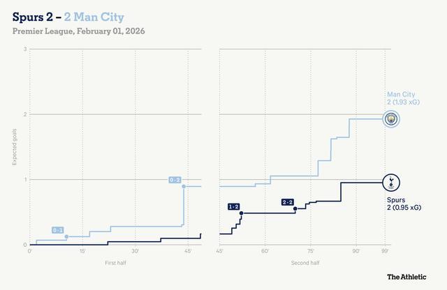 近年来他们对阵曼城的战绩出色,然而半场时无人预料到这个结果。热刺上半场行动迟缓,似乎只有哈维-西蒙斯是唯一能提供能量火花的球员。这位荷兰国脚的任意球是热刺仅有的中目标射门。格伊和胡桑诺夫并未受到穆阿尼和索兰克的威胁。
