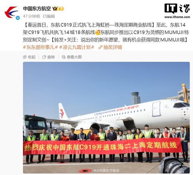 IT之家 2 月 2 日消息,今天(2 月 2 日)春运首日,东航国产大飞机 C919 开始执飞上海虹桥至珠海的定期商业航线,至此,东航 14 架 C919 飞机共执飞 14 城 18 条航线。