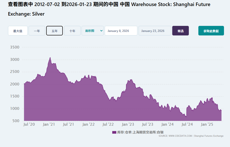中国自古以来白银矿产资源就相对匮乏,但中国拥有年处理量超2万吨的白银精炼产能,叠加中国新能源产业的庞大需求,中国长期以来一直是全球白银最大的工业消费国,同时也是重要的白银出口国。而自去年年中以来,上海期货市场的可交易白银库存出现显著下滑,且持续逼近历史低位。(现在面对国内的白银工业需求,中国也面临较大白银供应需求考验。)