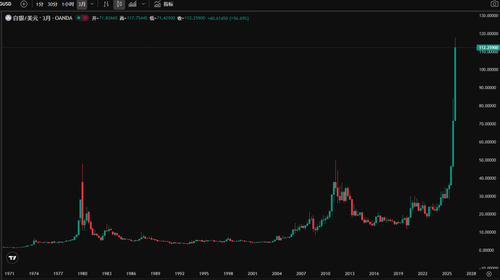 同时我们还可以注意到,黄金价格创下历史高点的阶段,几乎也是金银比价创下历史低点的阶段。1980年1月,白银价格触及阶段性高点,金银比价也创下约15的阶段性低点(即15盎司白银可兑换1盎司黄金)。而在2011年,白银创出历史高点的时候,金银比大约为30。而截至2026年1月29日下午,金银比大约为44。