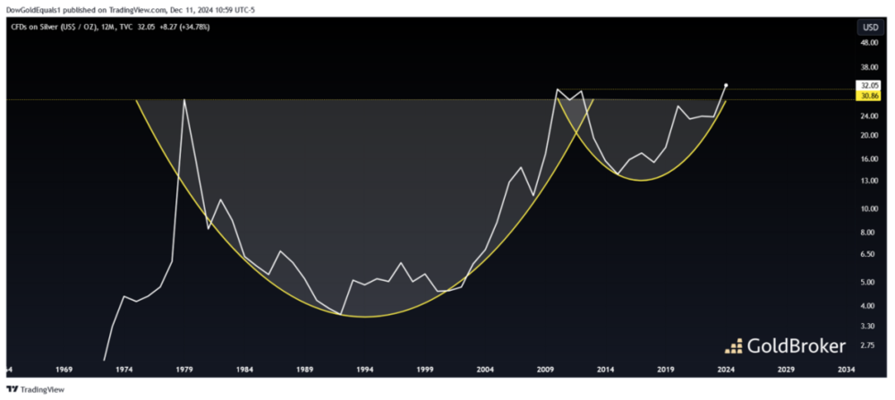 白银在突破前,呈现出近乎完美的杯柄形态,随后白银价格快速上升