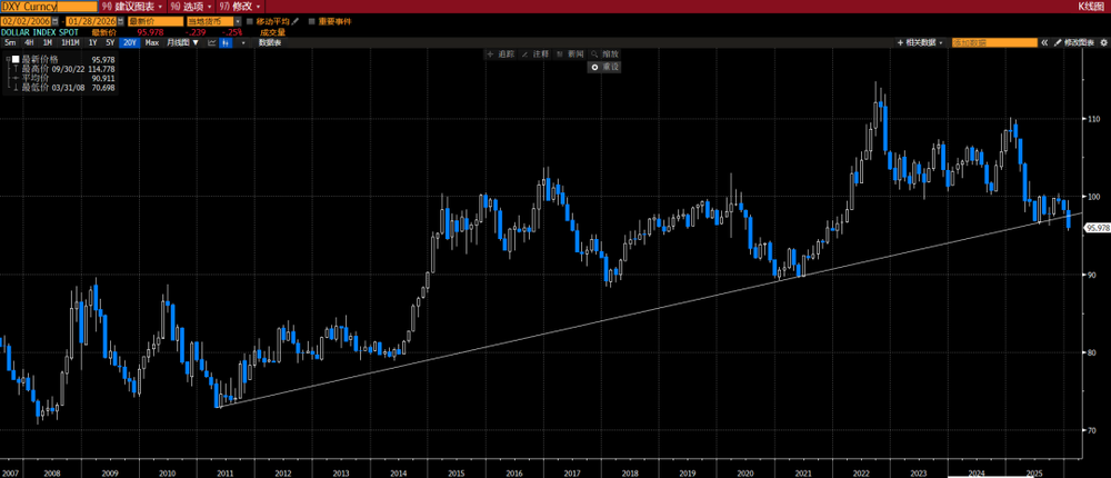 尽管美国最终并未采纳“海湖庄园协议”,但美元的加速贬值态势并未终止;反而受特朗普推行的弱美元政策,以及其试图掌控美联储等举动的影响,美元指数于2026年1月底跌破关键点位。此次跌破具有历史性意义,这意味着如果沃什政策的强美元预期失效,美元或迎来长周期的加速下跌行情。