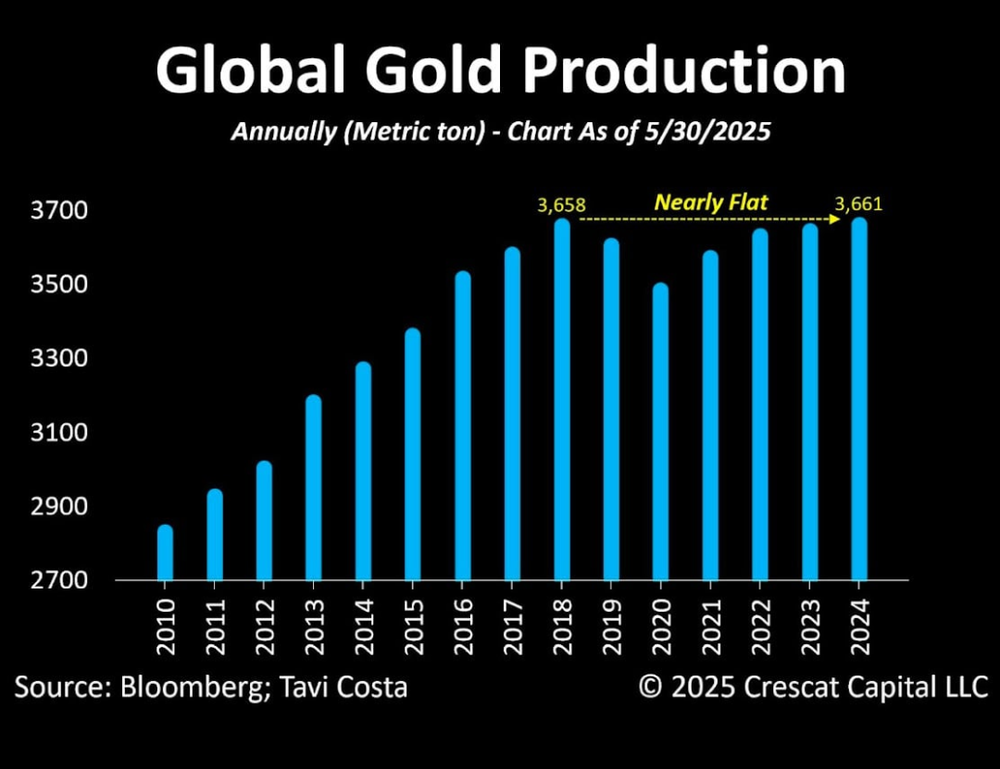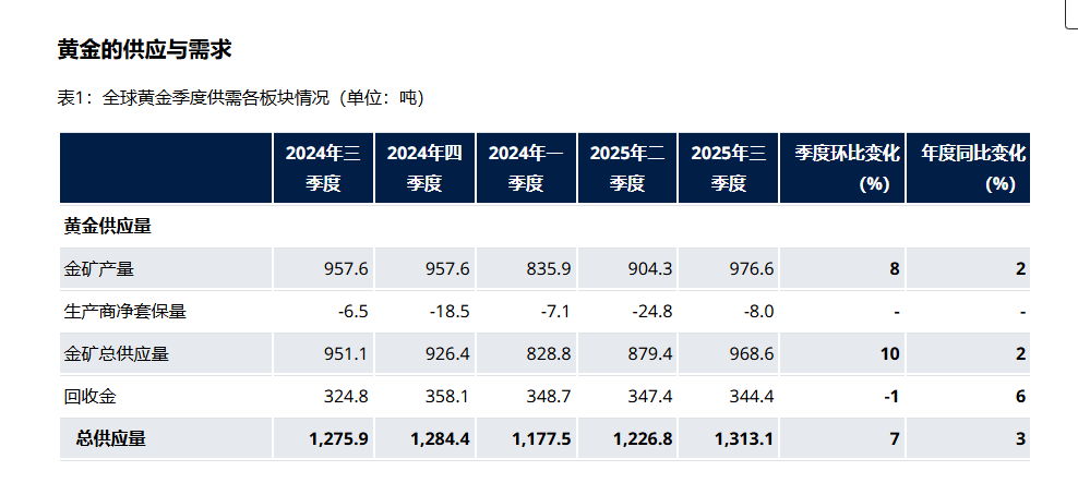 事实上,如果你关注相关数据,会发现,与普遍预期不同,黄金的产能并未随价格上涨而大幅提升,反而长期处于相对低位。根据世界黄金协会发布的最新数据,在黄金价格暴涨的2025年三季度,全球黄金总供应量为968.6吨,较2024年三季度的951.1吨,同比仅增长2%,即便再生金供应量增长6%,2025年三季度黄金总供应量较2024年三季度也仅增长3%。而2025年三季度最后一个交易日,伦敦现货黄金现货收盘价已触及3858.29美元/盎司,相比于2024年三季度伦敦现货黄金开盘价格2326.44美元/盎司上涨超过50%。
